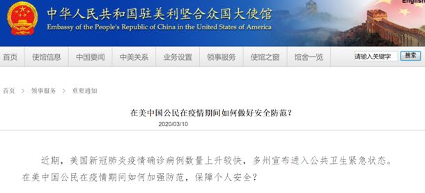 紧急状态。3月10日,驻美国大使馆提醒在美中国公民疫情期间做好如下