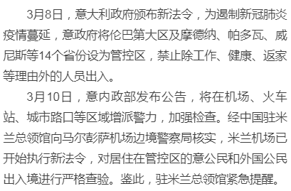 意大利:政府加强封锁区人员流动管制 驻米兰总领馆提醒严格遵守防疫法令