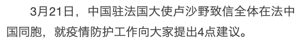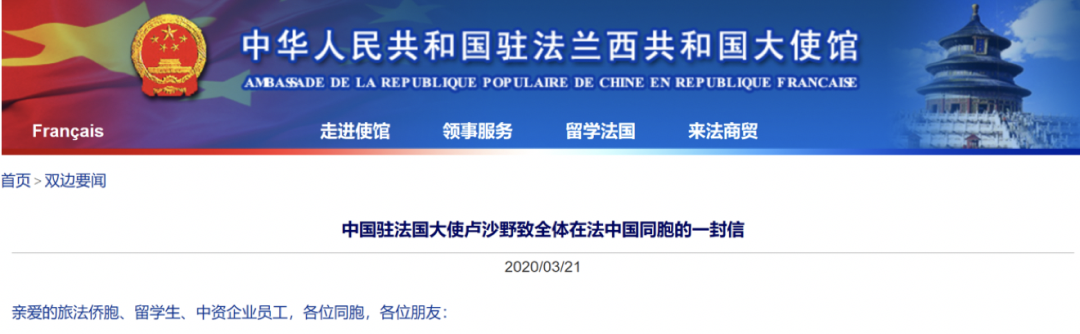 法国:驻法国大使致信同胞建议疫情在不远行