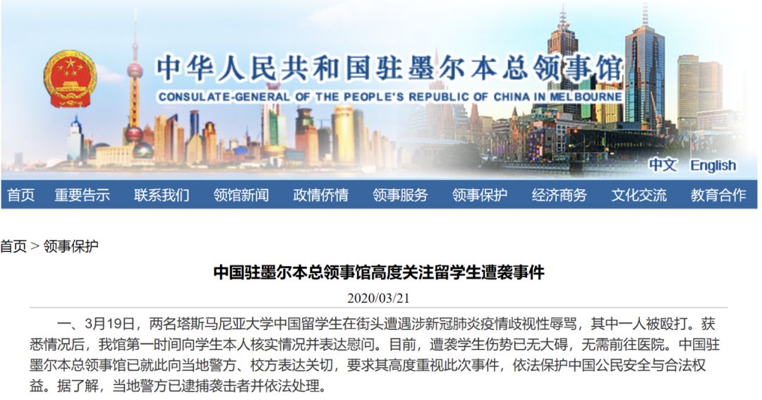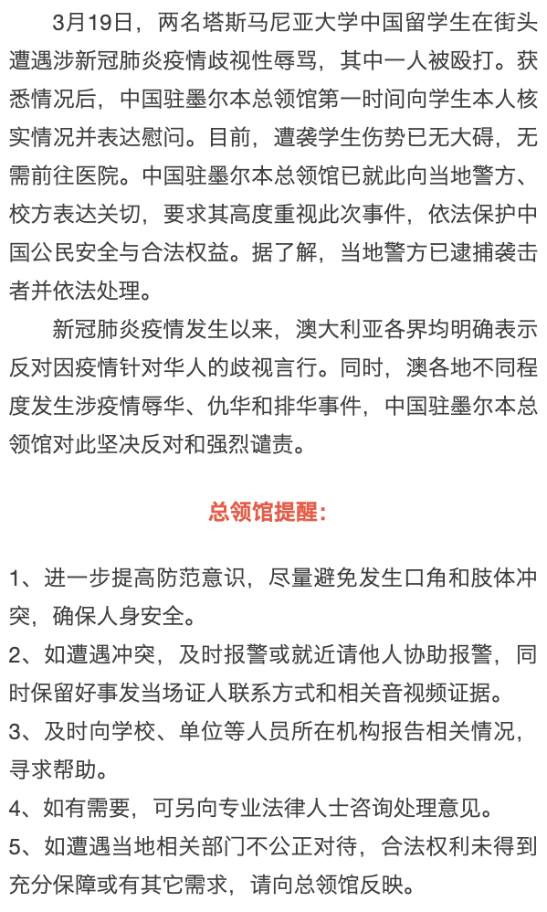 澳大利亚:两中国留学生街头遭袭 驻墨尔本总领馆提醒加强防范
