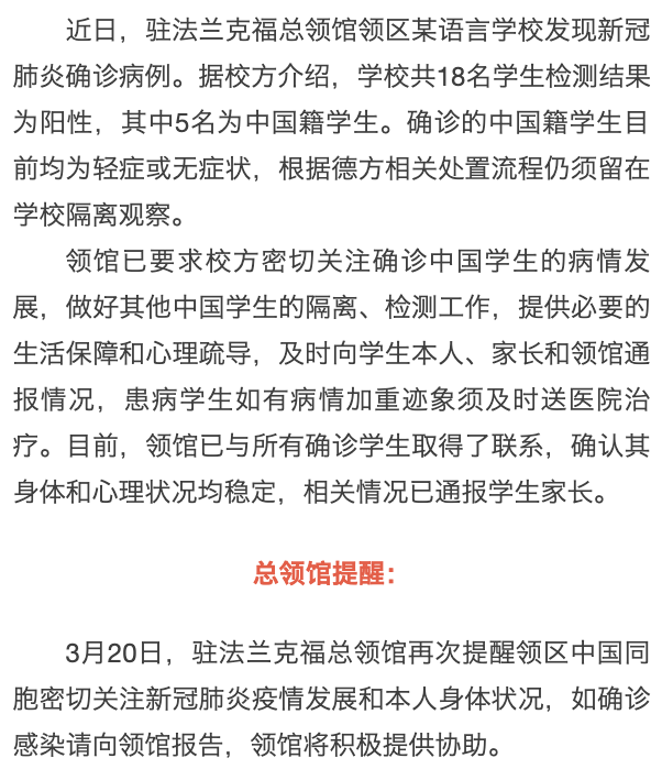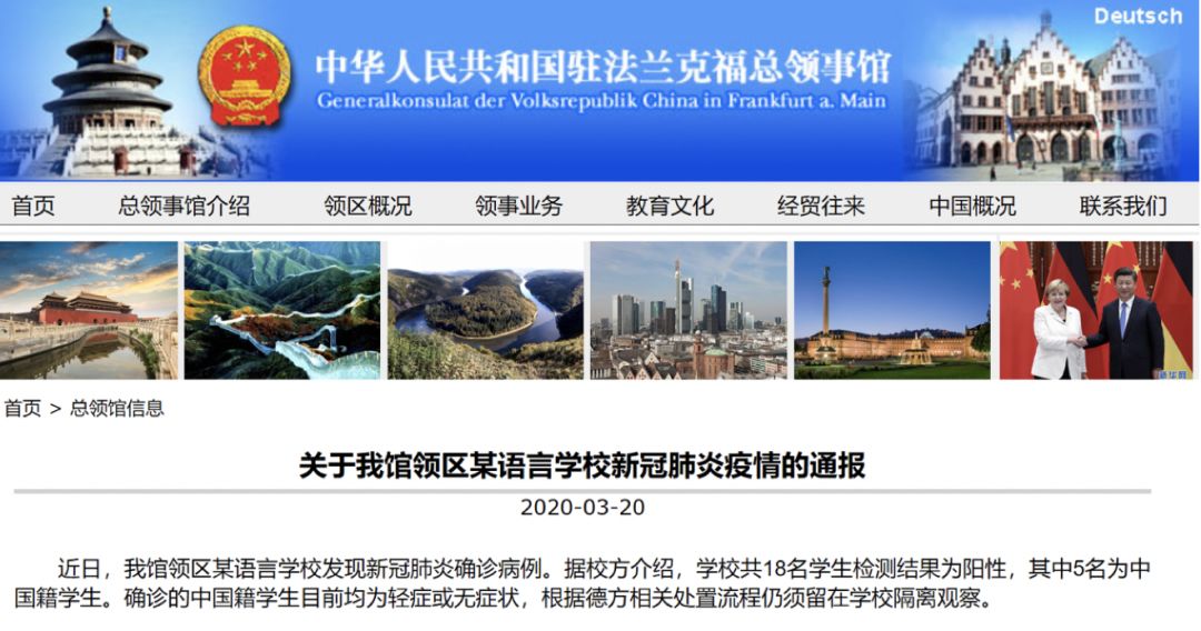 德国:5名中国留学生确诊感染新冠肺炎 驻法兰克福总领馆提醒关注疫情发展