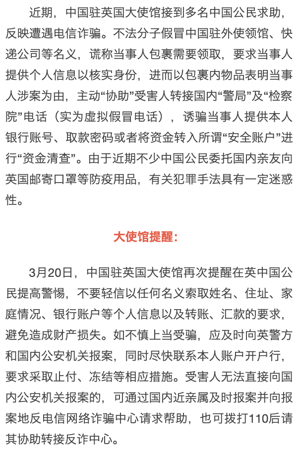 英国:驻英国大使馆提醒疫情期间注意防范电信诈骗