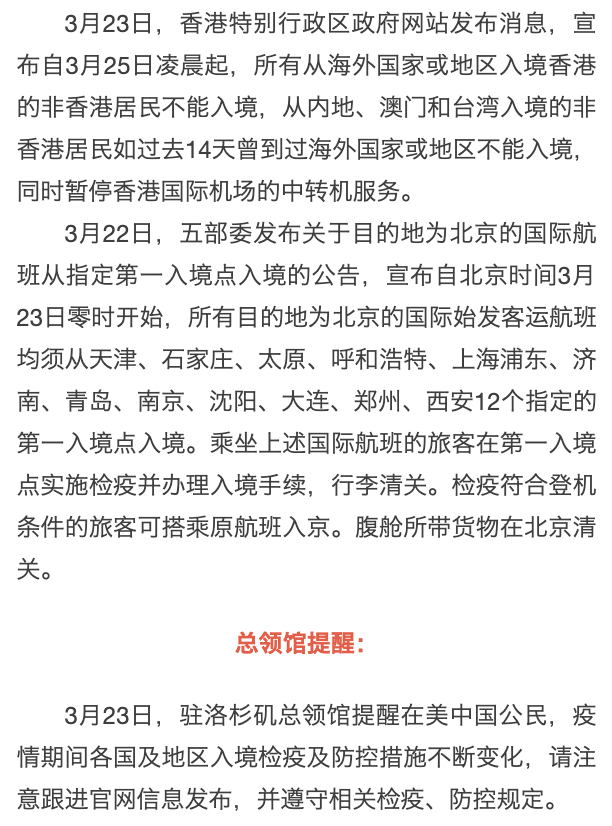 美国:驻洛杉矶总领馆提醒关注国内最新入境、转机措施