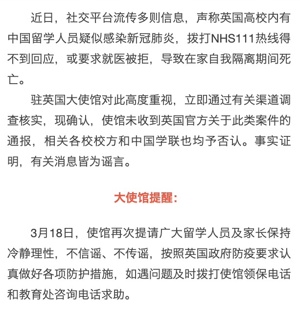 英国:中国留学生求医被拒在家隔离死亡?驻英国大使馆提醒不信谣不传谣