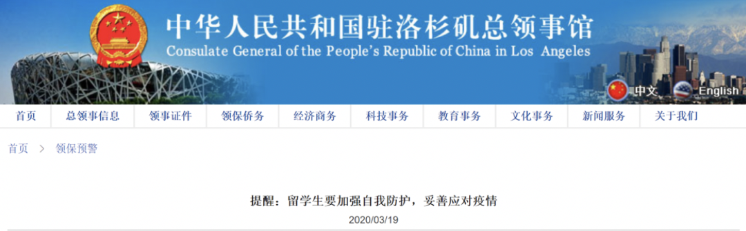 美国:驻洛杉矶总领馆醒留学生加强自我防护 妥善应对疫情