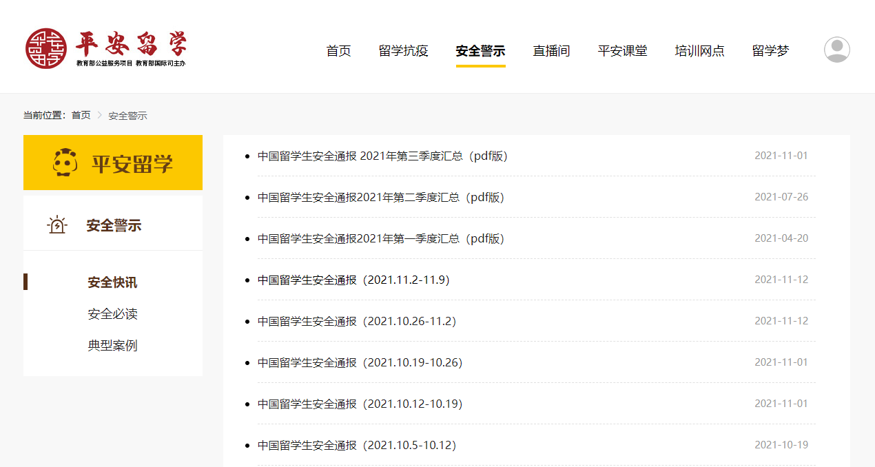 在“安全警示”频道中,上线了安全快讯、安全必读和典型案例,帮助留学人员了解留学目的国安全形势,认识各类留学风险,增强安全防范意识。