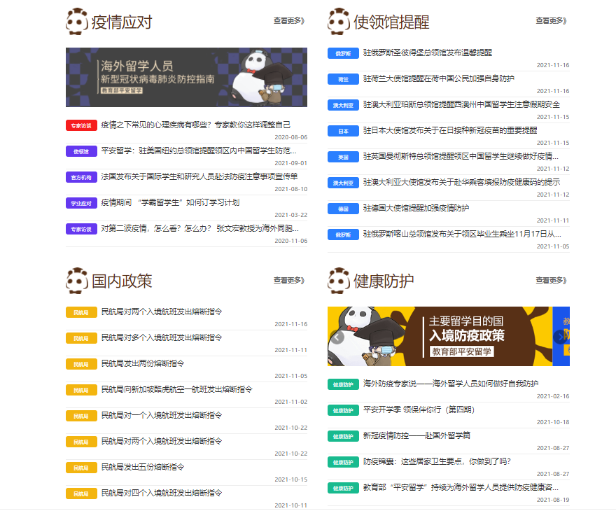 其中,在“留学抗疫”频道,设有国内政策、健康防护、疫情应对、使领馆提醒等几大主要板块,为广大留学生汇总最全国内最新政策、发布最新疫情防控须知、分享最热平安课堂。