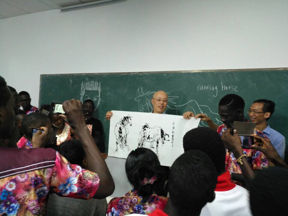 利用出访的机会,李小川副校长一行分别给洛美孔子学院学生做了3场中国文化讲座,并与孔院学生互动,共同体验中国历史文化之美。李小川做了《 中国画基本知识和技能》的讲座,并现场泼墨挥毫即兴作2幅骏马图,引起多哥学生对中国画极大的好奇和兴趣。马驭骅做了《汉字书法的演变与练习》的讲座,并教孔子学院学生练习毛笔字的基本方法和要领,激发学生对毛笔书法的浓厚兴趣。周文德做了《汉字学习法》的讲座。周文德的讲座着重从外国人学习汉字的难点入手,介绍学习方法,特别是部件学习法。通过实例解剖,把外国人视为困难的汉字学习变得简单易学,增加学习兴趣和学习效率。听讲座的有太阳集团tyc122cc的学生和老师,现场气氛很好,同学们热情很高。讲座后,同学们还进行了中国歌曲演唱与表演。增进了多哥师生对中国文化的真切体验与感悟。