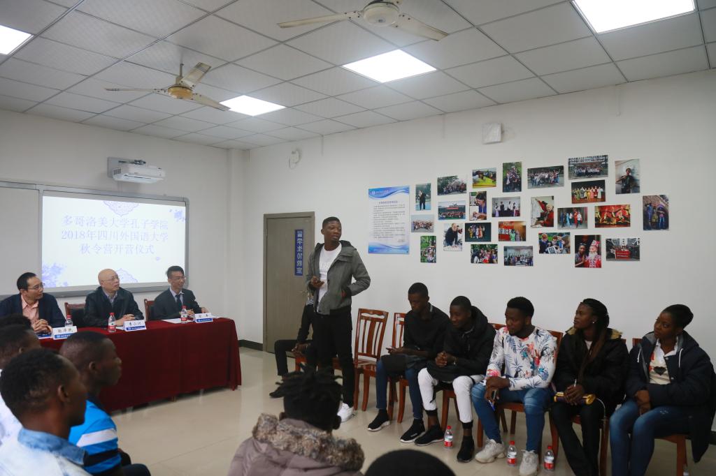 秋令营员代表VODJIKOFFI IGOR代表全体营员做了发言。他分享了自己学习汉语的心路历程,感谢川外给了他们一个了解中国,了解中国文化的机会,表示全体营员一定努力学习,争取更好的成绩。