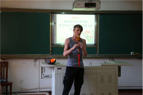 之后,学员们进行了才艺演出。学员们以一首俄文歌曲《喀秋莎》点燃气氛,演唱了中文歌曲《青花瓷》、《青春修炼手册》,歌伴舞《三寸天堂》,表演了中国民俗乐器葫芦丝,并且带来了学生个人杂技表演,更让现场气氛达到高潮。这些节目更充分展示了学生们汉语学习的成果和学生们的多才多艺,赢得了校领导和到场嘉宾们的热烈掌声。