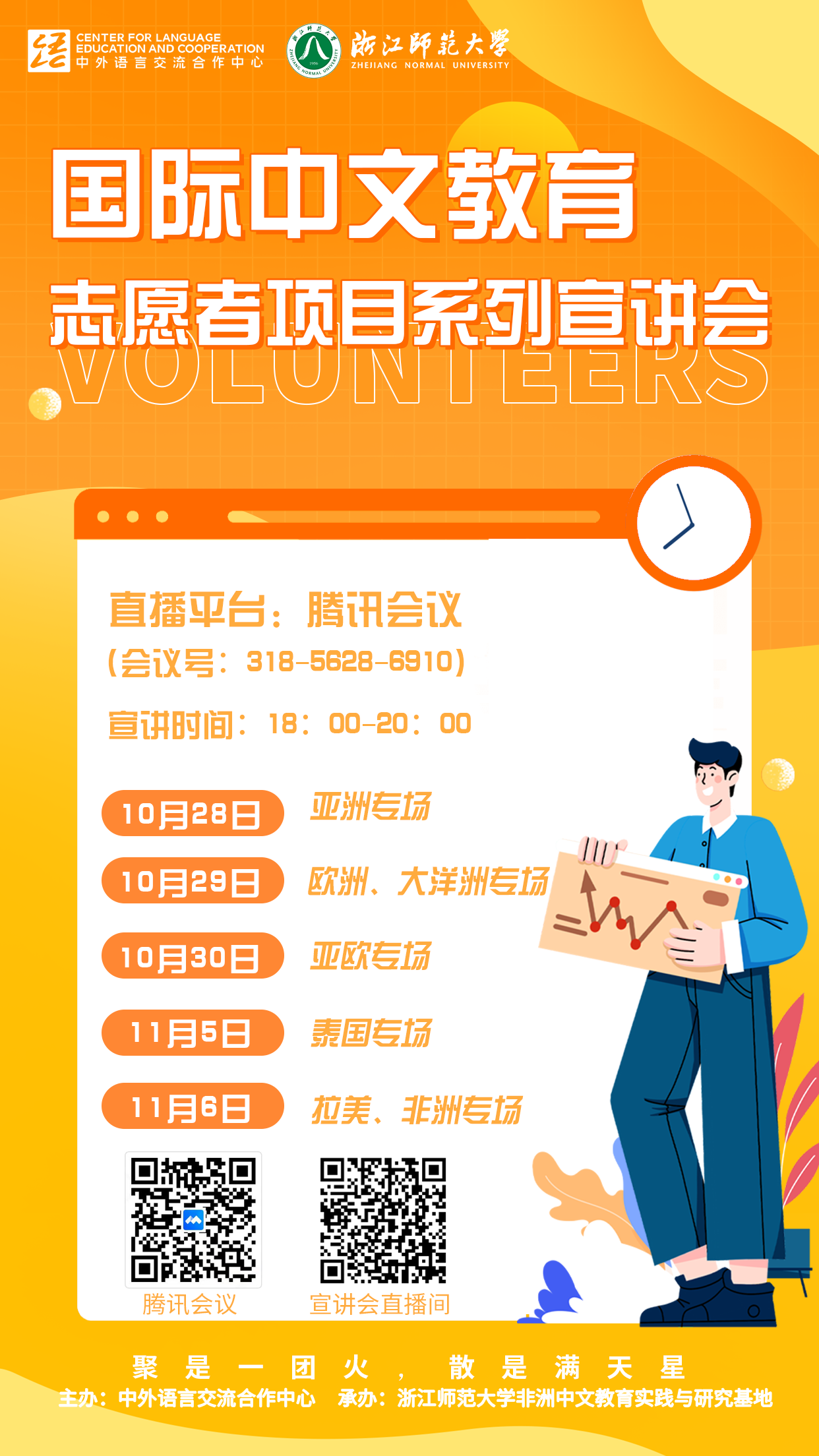 中外语言交流合作中心将从10月28日起组织“2023年国际中文教育志愿者系列宣讲会”,现将宣讲会相关信息发给大家,请汉语国际教育和相关专业对此志愿者项目感兴趣的学生自行前往观看!