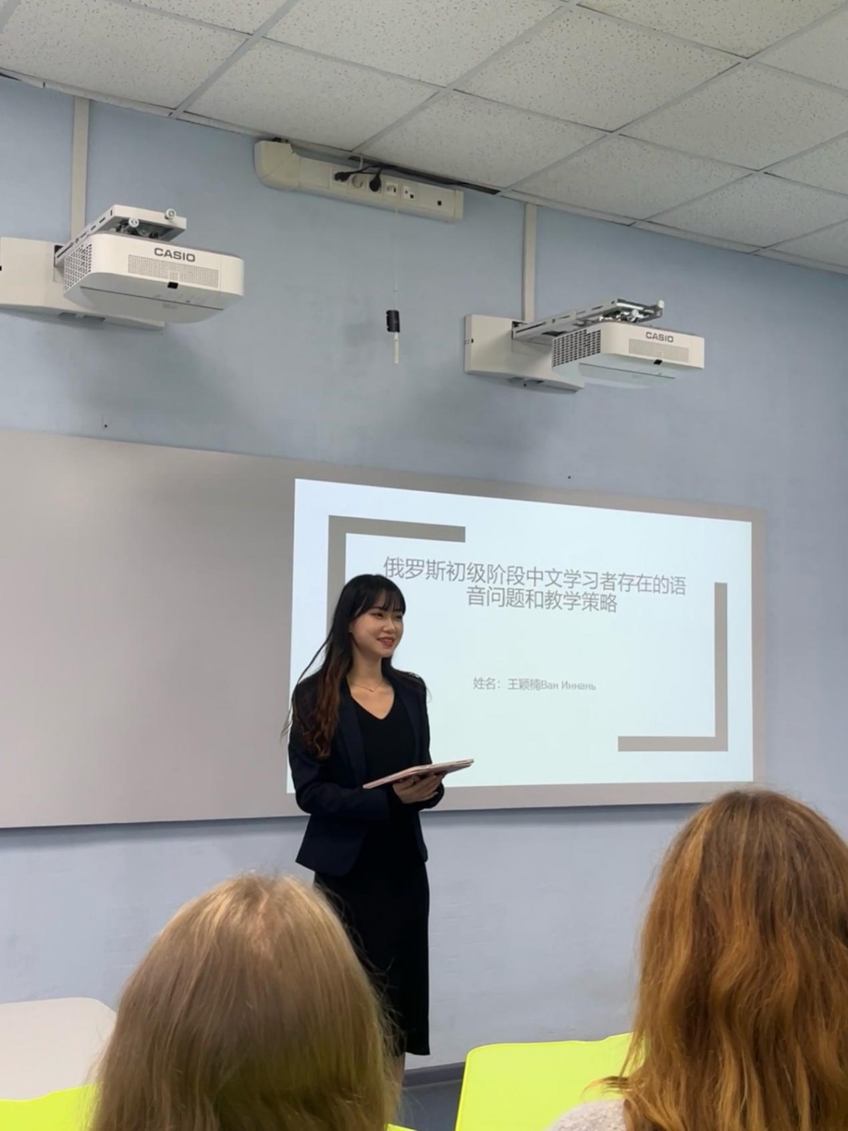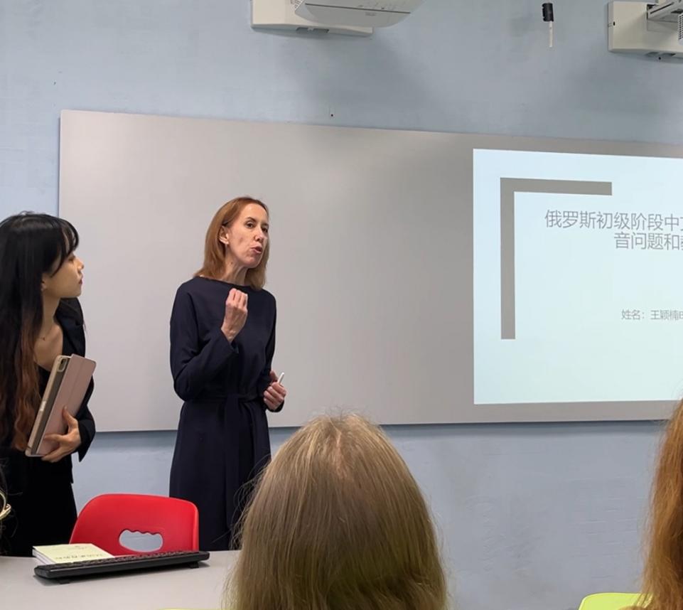 会上,王颖楠与谢玉梅就“俄罗斯初级阶段中文学习者存在的语音问题和教学策略”做了学术报告。中外方教师各自从自身的视角总结了教学中的心得和体会,报告用中俄文完成。这是中方老师与本土老师首次合作完成报告。