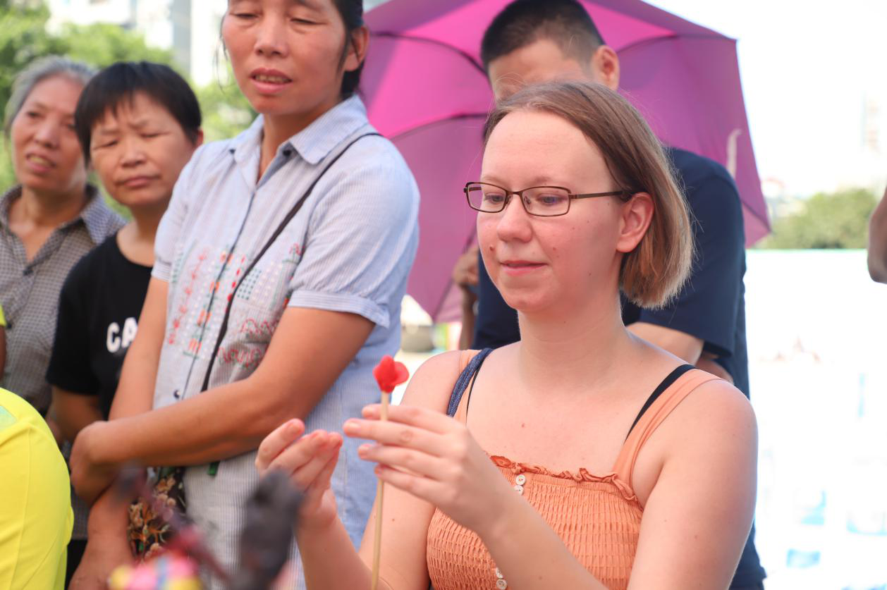 鱼洞街道党工委书记朱明勇致辞后,大家一起观看了舞蹈《闺绣》、表演唱《酒歌庆丰收》、独唱《但愿人长久》等具有地方特色的表演节目。其间,主办方还邀请外教们上台进行了制作月饼比赛、并在赛后为他们颁发了“最佳快手”、“最具创意”等奖项。演出结束后,外教们在现场亲自体验了其它具有地方民俗特色文化项目:鱼洞乱针绣、姜家舞龙、木洞山歌、重庆面塑、剪纸等等。大家还收到了主办方精心准备的小礼品。
