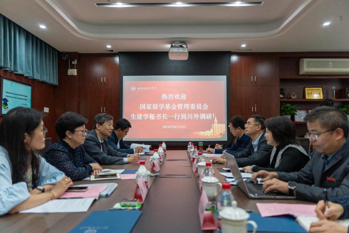 10月12日上午,国家留学基金委秘书长生建学莅临我校调研,美大事务部主任孟莉、出国留学选培部主任杨祥义、副主任杨烨陪同调研。座谈会在我校国际大厦4楼会议室举行,我校党委书记邹渝、党委副书记苟朝莉、教务处、人事处、国际合作与交流处、东方语言文化学院、西方语言文化学院、国际关系学院、新闻传播学院、国际法学与社会学院、国际教育学院、国际学院(出国培训部)等相关负责人参会。
