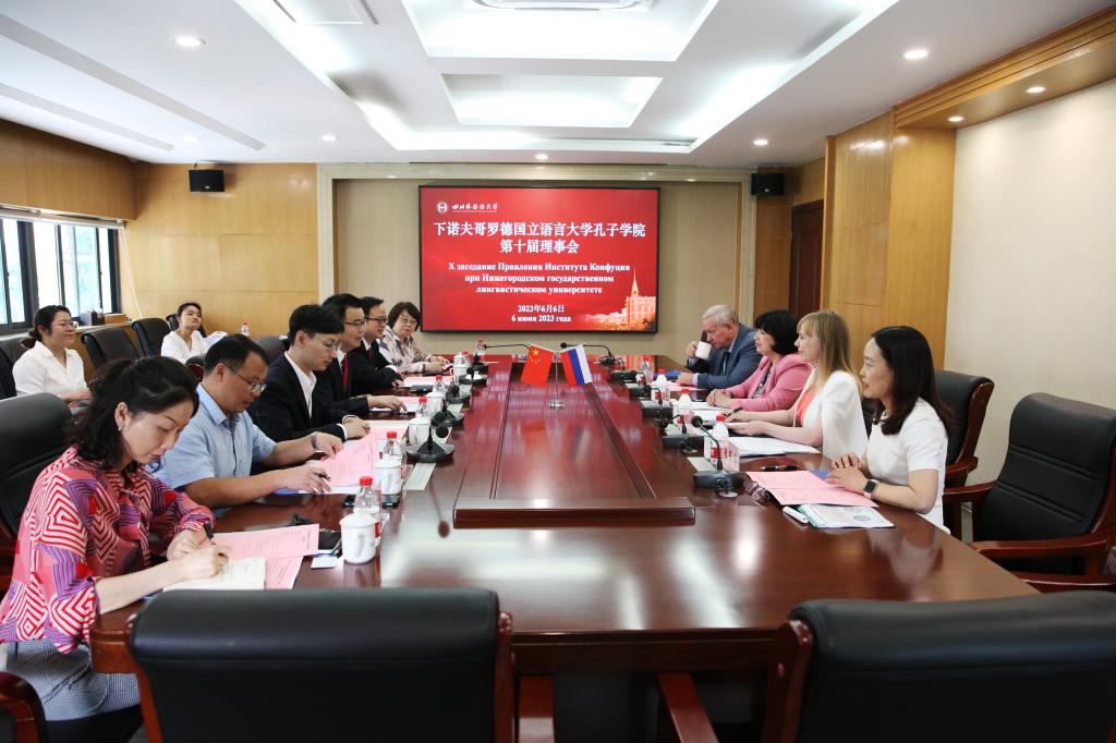 6月6日下午,俄罗斯下诺夫哥罗德国立语言大学(下语大)校长尼康诺娃(Nikonova Zhanna)、国际处处长安尼先科(Anishchenko Anatoly)、下语大孔子学院外方院长普罗沃托罗娃安娜(Provotorova Anna)一行来访我校并出席下语大孔子学院第十届理事会。我校校长董洪川、副校长祝朝伟、国际合作与交流处处长张幼斌、计划财务处处长于全辉、国际合作与交流处副处长朱红、下语大孔子学院中方院长敬菁华出席本次会议。会议由张幼斌主持,俄语学院教师付景担任翻译。