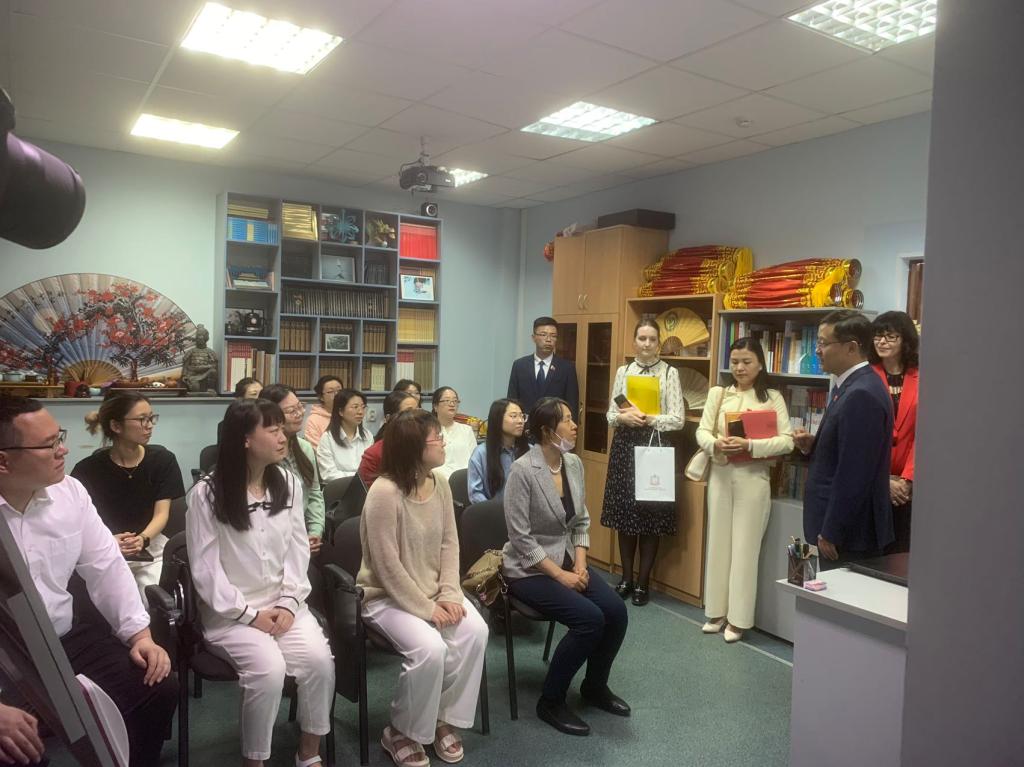 访问期间,向波总领事走访了中文专业课堂,了解了学生的学习情况,参观了下语大孔院图书馆,并与中方教师进行了座谈。他称赞下语大孔院中方教师们在汉语教学工作中的辛勤付出,肯定了下语大孔院在喀山领区汉语桥选拔赛中取得的优异成绩,同时鼓励中方教师们继续保持良好的工作状态。他表示中国驻喀山总领事馆将一如既往地关心和支持孔子学院的工作,为海外华人保驾护航。