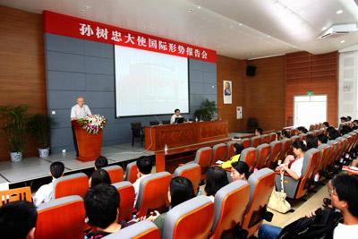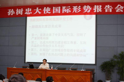 | 6月14日,“书香校园 名师讲堂”系列讲座之十在西区A报告厅举行。我国资深外交官,现任外交部创新实践委员会主任、读书会副会长,前中国驻卢旺达大使孙树忠给全校师生带来一场精彩的国际形势报告会。副院长李小川主持讲座。 孙树忠大使以时间为经,以国家和地区为纬,把近期发生的重大国际事件串起来,如“达尔富尔问题”、“利比亚战争”、“中东局势”、“日本地震、海啸及核辐射”、“朝鲜半岛的无核化”、“世界银行、国际货币基金组织与金融危机”、“胡锦涛总书记访美”等等。孙大使用生动、诙谐的语言,通过对这些历史事件的娓娓讲述,使听众不仅对当前国际形势的曲折性、复杂性、动态性和发展走向有一定了解,同时对国际形势与世界政治、经济、外交之间的关系有了深刻认识。讲座后同学们纷纷表示深受启发,获益匪浅。 本次讲座由教务处和外事处共同主办。 (外事处) |