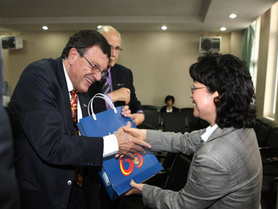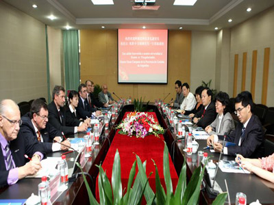 李建平副校长首先代表学校阿根廷科尔多瓦省副省长甘帕纳先生一行的到来表示热烈的欢迎,并对我校的历史和现状做了简要的介绍。我校是我国在西南地区唯一的一所语言类高等院校,已经在国际文化教育交流方面积累了很多经验,我们愿意并且衷心地期望能与阿根廷的高校建立合作关系。此后,双方就共同关心的问题展开了热烈的讨论,并且就以师生培训为重点的教育合作交流以及孔子学院计划等核心问题初步达成一致意见。