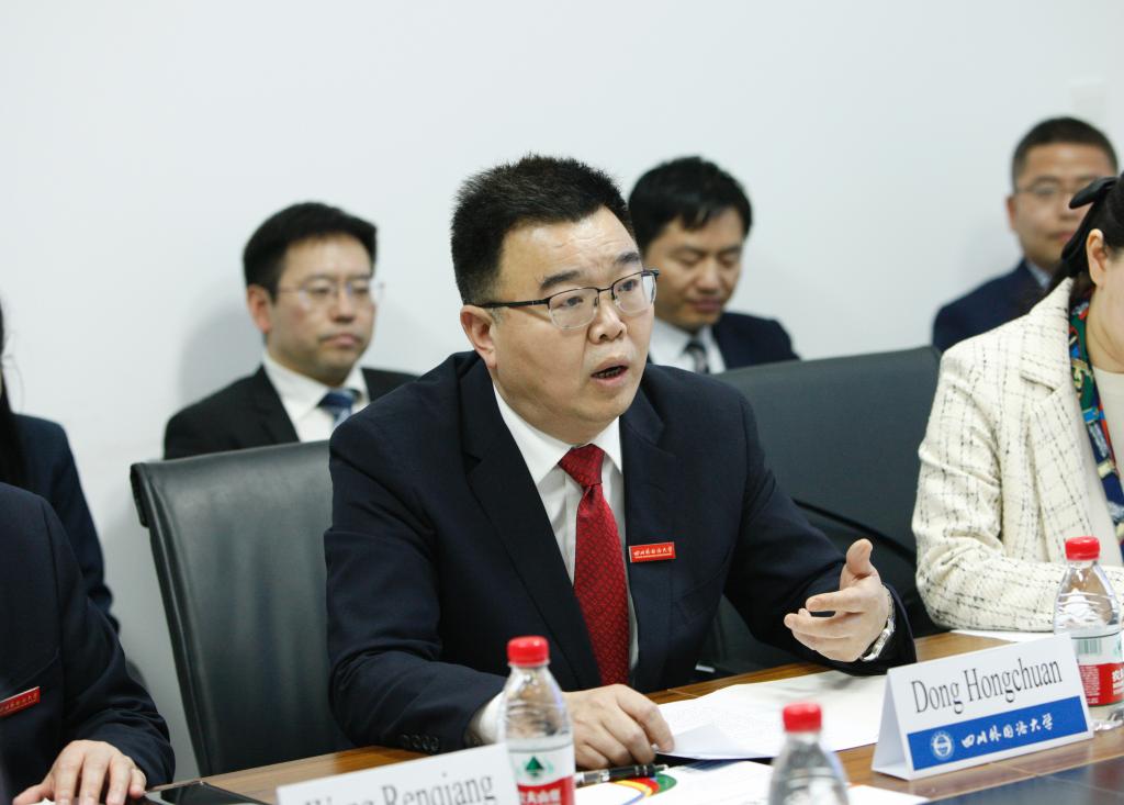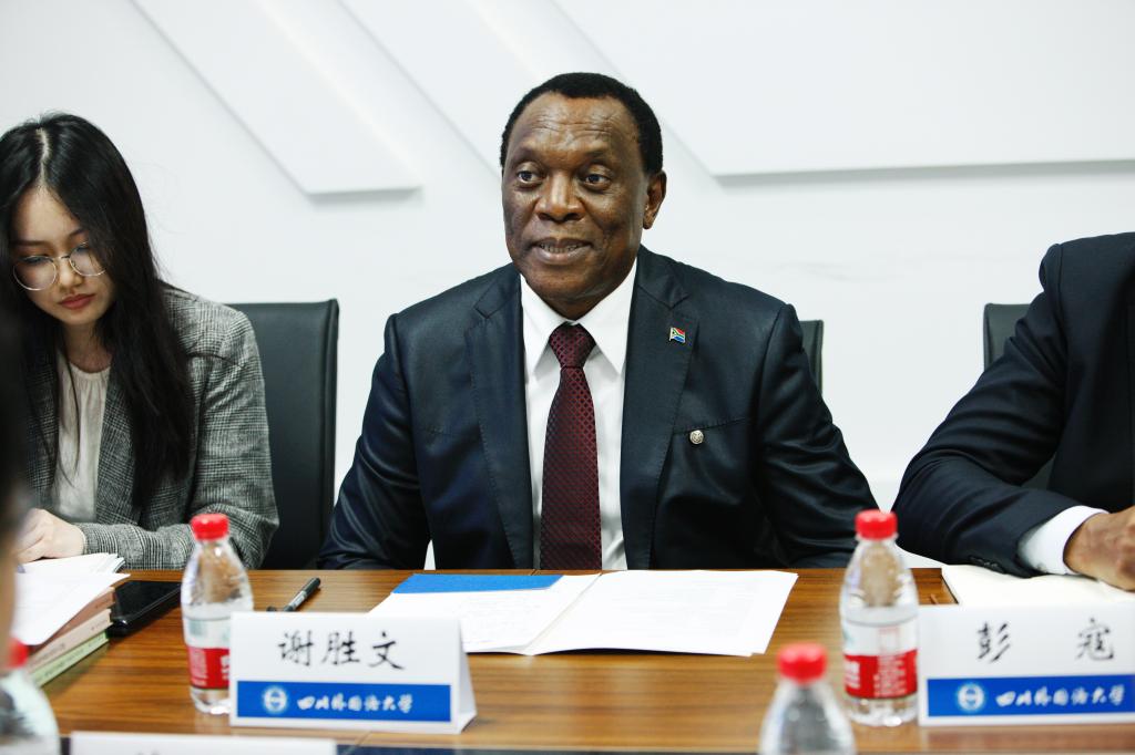 董洪川校长对谢胜文大使一行的来访表示热烈欢迎,并从学校办学历史、学科专业设置、人才培养、国际合作与交流、智库建设等方面向来宾进行了简要介绍。他表示,学校期待在大使的支持下与南非高校和研究机构开展师生交流,同时提议可探讨在南非合建孔子学院,并在川外设立南非研究中心开展南非国别研究。