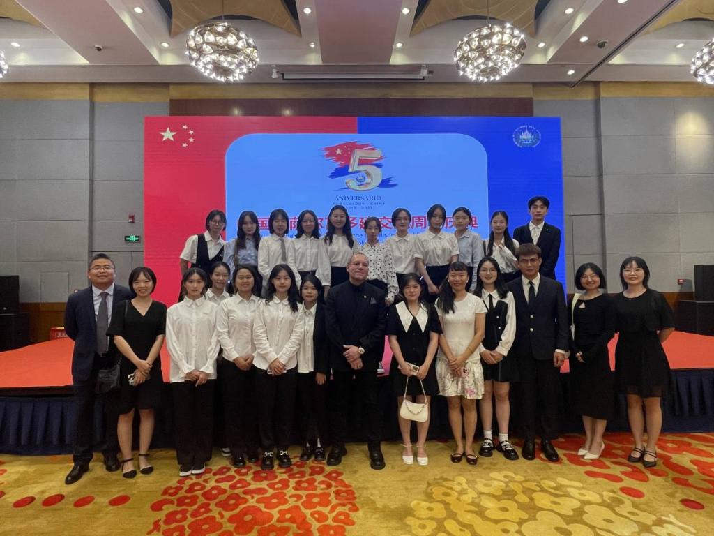 2023年9月6日,中国与萨尔瓦多建交五周年庆典在重庆市渝中区解放碑帝晶酒店宴会厅举行。萨尔瓦多驻华大使阿尔多·阿尔瓦雷斯、中国政府拉美事务特别代表邱小琪、重庆市副市长张国智出席庆典并致辞。太阳集团tyc122cc西方语言文化学院西班牙语专业师生代表受邀参加本次庆典。