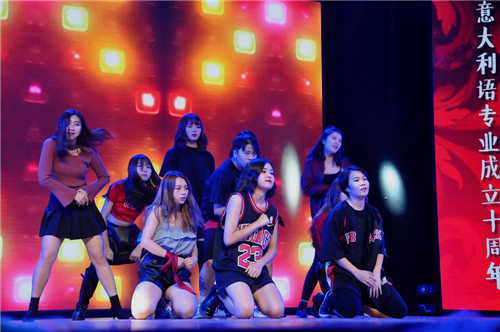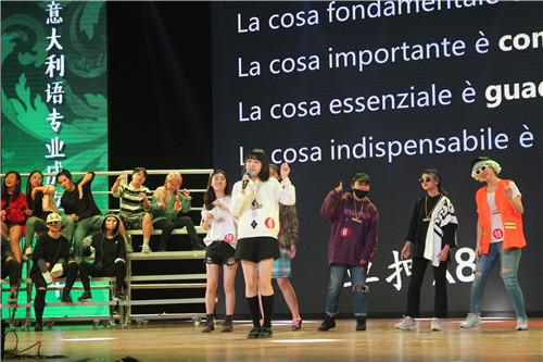 整场晚会主持与表演都采用意大利语与中文双语。由校街舞社带来的开场舞《因为你》点燃了会场的气氛与观众的热情。意大利语专业学子也带来了极具中华文化传统与意大利文化特色的精彩演出:意大利语专业大一学生演唱了欢快活泼的意大利儿歌《花做的桌子》。同学们右手系红色丝带,左手系绿色丝带,身穿白色衬衫,象征了意大利红白绿三色国旗,体现了川外新一届意大利语专业学子蓬勃的朝气。意大利语专业外教在电影《美丽人生》的配乐中深情朗诵了《诞生之歌》与《韵言颂》两首优美的诗歌;由2014重庆小姐冠军胡梦瑶与我校非遗文化推广基地带来的旗袍走秀《霓裳丽影》和古风节目《大鱼》,充满浓郁的中国传统文化韵味;由意大利语专业学生表演的戏剧《有三个货仓的船》将全场观众的热情推向高潮,演员台词功底扎实,对答流利,活灵活现的表演引得观众捧腹大笑,惊呼“演技在线”;法语美声独唱《我的故事》、意大利语版双人合唱《想你的夜》旋律优美动人;由意语专业大四学生带来的情景剧《川外有嘻哈》则将他们四年所学与对川外浓浓的爱传达给观众。