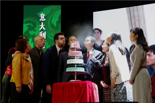 晚会最后,李克勇与总领事Nicosia先生同嘉宾们共同切开代表中意友谊的蛋糕,祝福川外意大利语专业成立十周年,同时邀请在场师生们共同分享这一份欢乐与幸福。