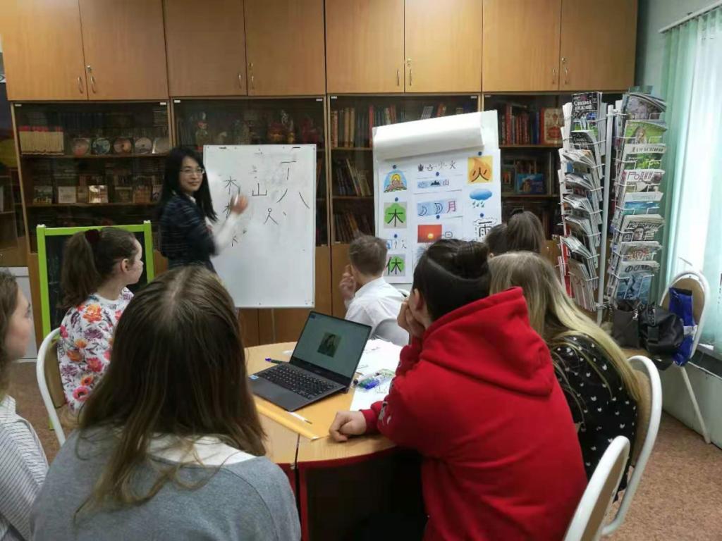 下诺夫哥罗德语言大学孔子学院派出两名老师参加此次活动。王媚老师给大家介绍了“造字圣人”仓颉,还为他们讲解了基础汉字的起源和构成,比如:山、木、水、火、雨、人、日、月、林、休等并示范汉字的写法。在结合图片讲解的过程中,学生都能快速而准确地猜出对应的汉字,并积极上台写汉字。陈春红老师为大家播放了《象形文字》视频和汉语歌,使大家对汉字有了更直观形象的了解。通过短短几分钟的学习,参会者对于汉字、汉语都有了初步的认识,而且给他们留下了一个良好的印象——汉语并不难学。