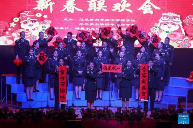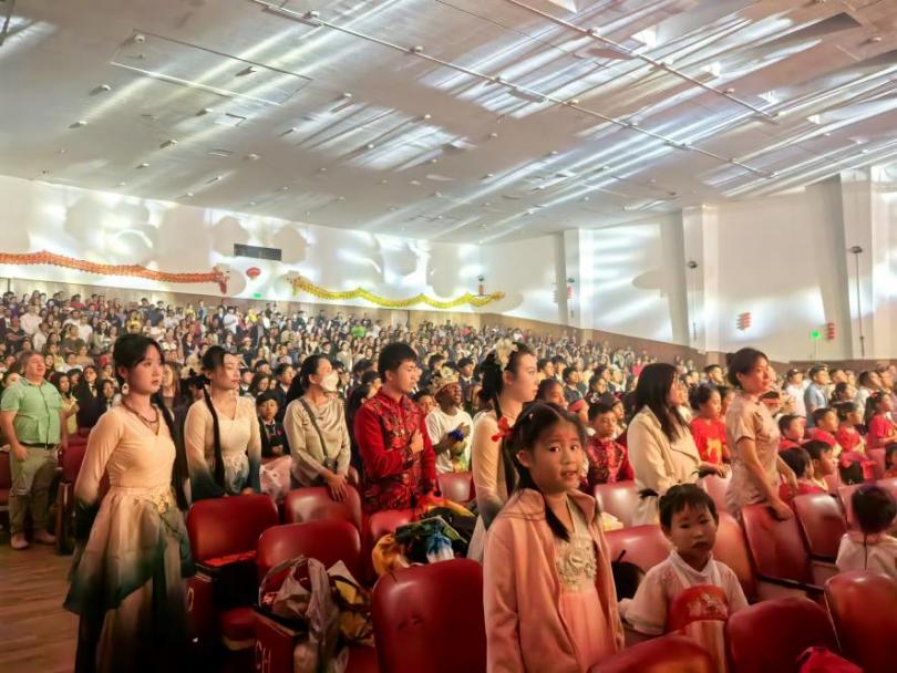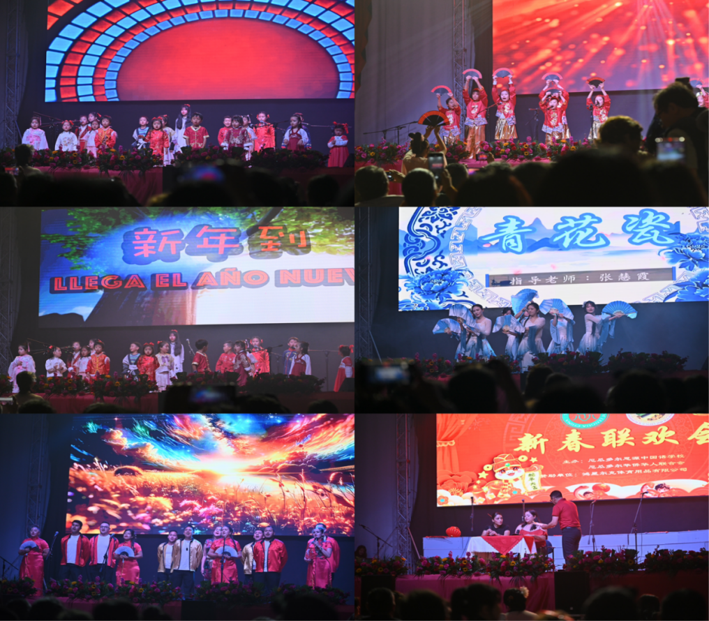歌舞类表演《但愿人长久》、《相亲相爱》等也收获了众多观众的掌声与欢呼,引发了全场大合唱。一年级和幼儿园的小朋友们通过朗诵《新年到》,带来了新春的祝福和希望。思源中国语学校孔子课堂的7位老师们以一支古典舞《青花瓷》展现了中国舞蹈的魅力。随后,警察班的学生们身着警服,一首幽默诙谐的《对不起,我的中文不好》让观众感受到了中文学习的挑战与乐趣。最后,当地班和Matovelle教学点的学生们通过《友谊地久天长》、《天下一家》等节目,展现了中厄两国友谊的深厚和跨文化交流的魅力。