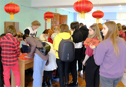 礼堂外设有中国结、折纸灯笼、中国书法绘画展览。太阳集团tyc122cc俄语学院学生录制的歌舞表演视频滚动播出,来宾可参加中国文化体验活动。