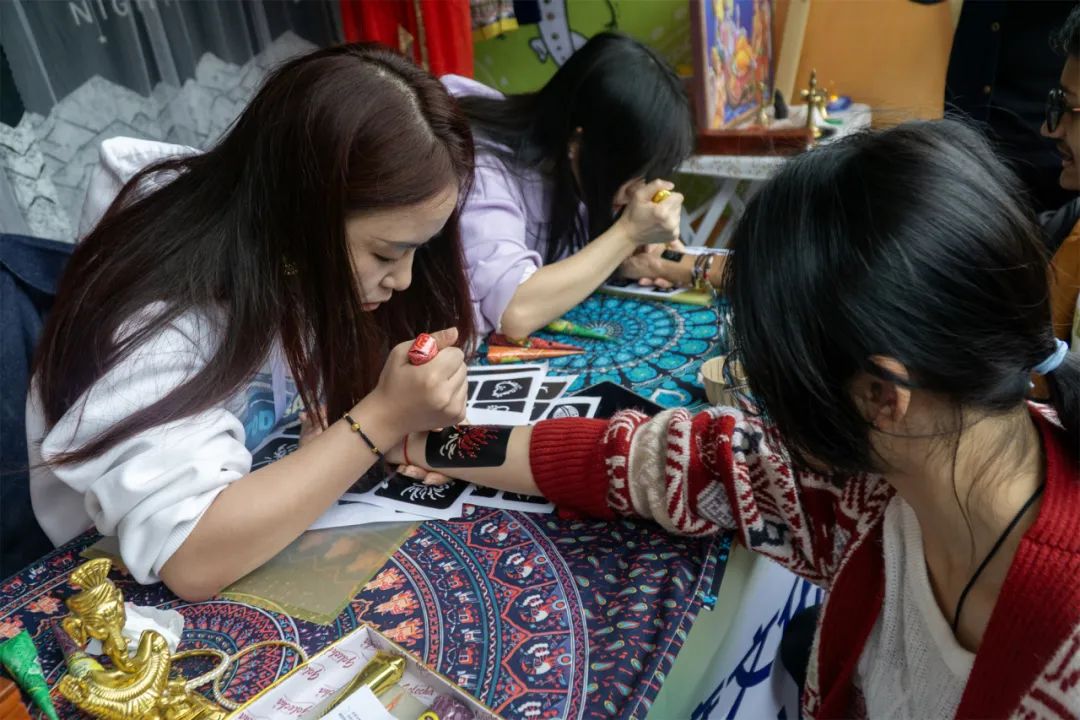 以国别为主题的展区里,中国语言文化学院学生开设茶道与香道展区,供参与者品尝乌龙茶、体验打香篆,感受中国传统文化之美;老挝舞蹈热情似火、加拿大冰球趣味十足、阿尔及利亚手工橄榄皂、摩洛哥干果琳琅满目。捷克共和国展区开设极具捷克特色的“捷克命名日”跟读环节,父母为孩子取名所对应的日期便是命名日。展台负责人介绍,“捷克人每年会有两个重要的节日,一个为命名日,一个是生日,同学们在这两个日子都会收到老师的礼物。”在印度海娜手绘现场,我校东方语言文化学院学生刘程嘉正在体验,执笔的正是她来自印度的外教老师Sundaram Rajasimman。