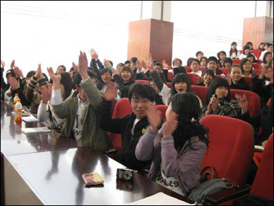 我校代表队由国关院07级学生陈果与英语学院学生李莉以及30名国关院学生组成的啦啦队方阵组成。两位选手在威尔士格林多大学(我校合作院校)老师的热情帮助下,运用丰富的知识和智慧,通力合作,积极答题,博得了在场观众的阵阵掌声。啦啦队方阵的30名同学也与场上选手配合默契,认真思考,协助选手给出正确解答,使团队取得了不错的成绩。