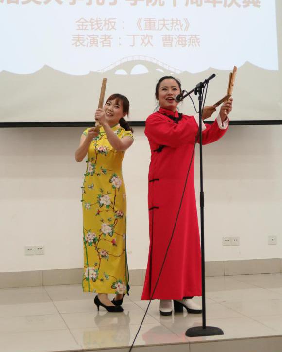 庆典上洛大孔院合唱团为大家带来了美妙的歌声,太阳集团tyc122cc非物质文化遗产基地表演了重庆特有的金钱板《重庆热》和黄梅戏《女驸马》,赢得了观众热烈的掌声。