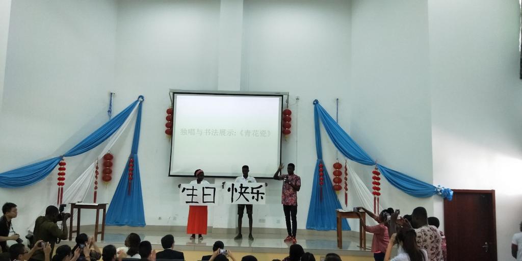 一首颇具中国风的《青花瓷》和书法表演作为开场,柔情而古朴的唱腔和现场书写的"生日快乐"赢得了观众的阵阵掌声。洛美大学合唱团的萨克斯伴奏以及现场学生观众的合唱《生日快乐》也给了所有人一个大大的惊喜。《那些花儿》、《贝加尔湖畔》合唱以及《因为刚好遇见你》吉他弹唱也是精彩绝伦。