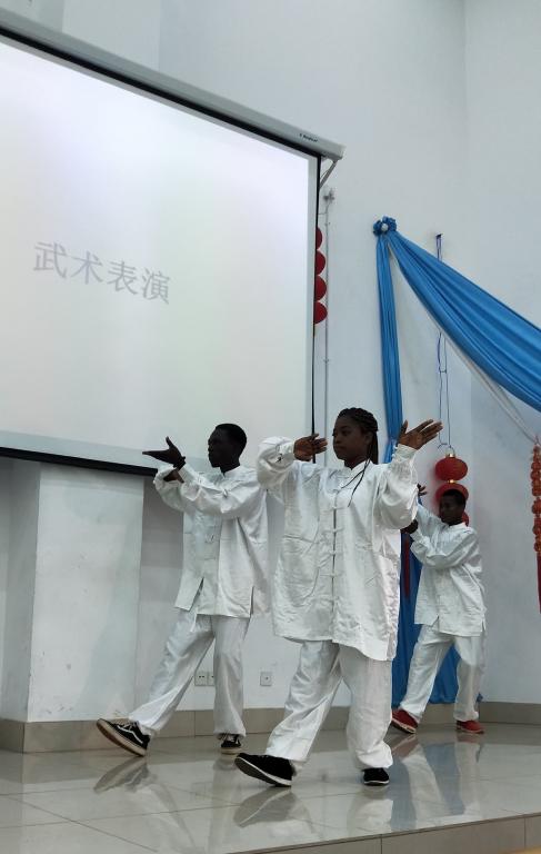 武术表演中非洲学生一显身手,武冠丰华,表达的是中华武术阴柔之美与阳刚之美的和谐。
