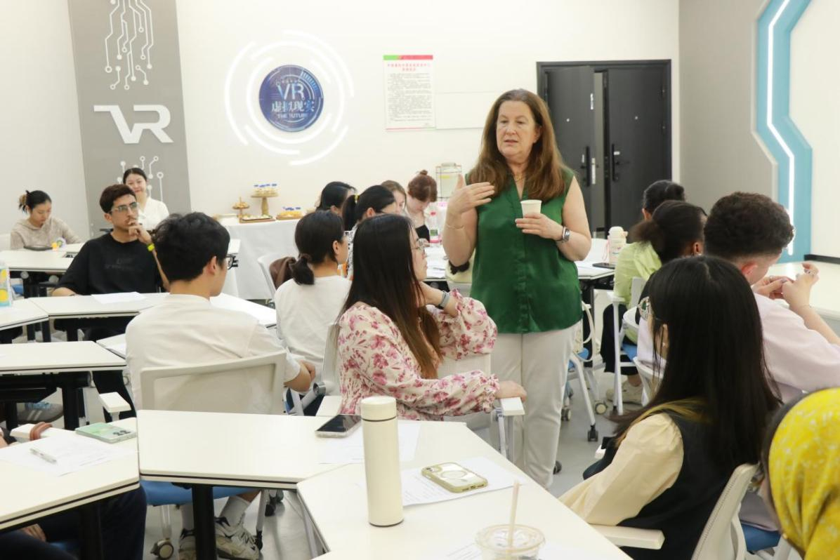 活动特别邀请英国籍外籍专家Dr. Roxana Preda担任主讲。这位拥有柏林自由大学、爱丁堡大学等世界顶尖学府执教经历的文学大家,以渊博学识展开深度思辨。在主题分享环节,她通过比较文学视阈剖析人工智能时代人文教育的守正创新,以现代诗歌为切入点,提出“技术赋能文学教育”的三大路径,引发在场师生对数字人文的深度思考。自由提问环节中,4名中外学子围绕“人工智能时代的文学价值重构”、“元宇宙叙事伦理”等前沿议题展开交锋,Dr. Preda以其横跨欧美的学术视野作出精彩回应,现场掌声经久不息。