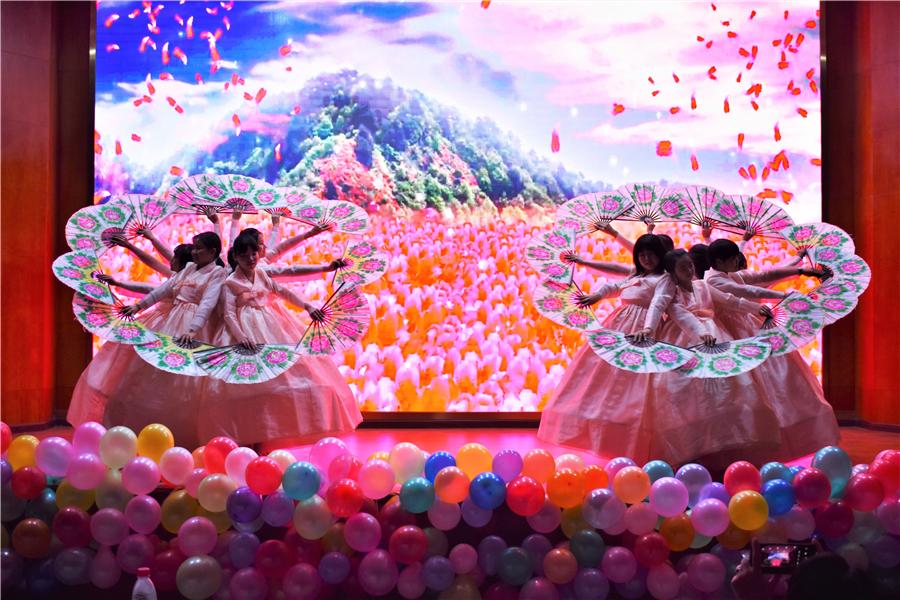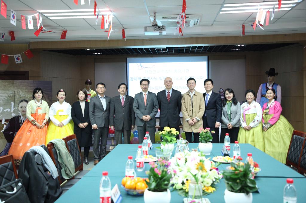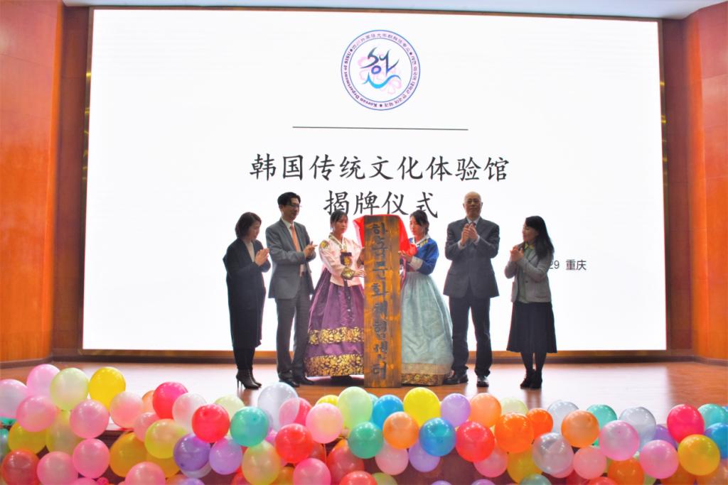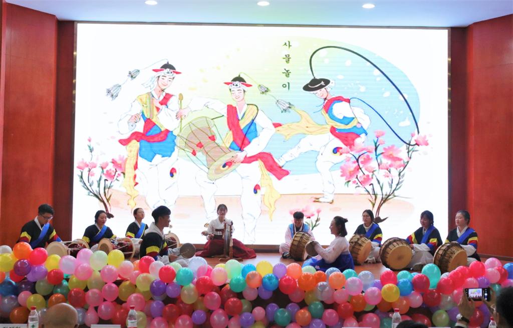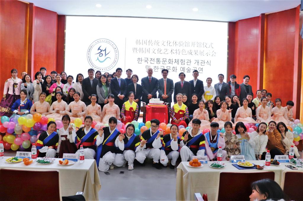 座谈会结束后,张蹄壑一行在李小川副校长的陪同下前往博文楼,参观韩国传统文化体验馆,并于培英楼放映厅观看朝鲜语专业文化艺术特色展示会。李小川副校长与张蹄壑总领事为表演致辞并进行韩国传统文化体验馆揭牌仪式。师生们发挥专业特色尽情展现长鼓舞、扇子舞、四物乐等一系列韩国文化艺术表演,美轮美奂的韩服秀,热烈动感的韩舞表演,不仅为来宾带来了一场视听盛宴,还体现出两国文化的融合和默契。演出尾声,大屏幕上播放了我校朝鲜语专业宣传片,展现了专业课堂特色和学生们丰富多彩的实践活动,体现了我校朝鲜语专业老师的专业性、学生学习的积极性,全场欢欣鼓舞,为中韩两国文化的交流和川外的发展喝彩。