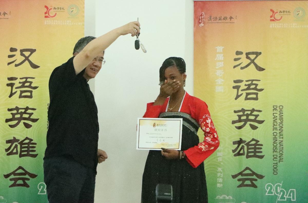 随后,洛大孔院为首届多哥全国“汉语英雄会”单项比赛决赛和总决赛的获奖选手举办了盛大的颁奖仪式。他们将获得由APSONIC公司和传音公司赞助的摩托车、手机等丰厚奖品。在颁奖仪式上,巢卫东大使和贝芭副校长分别进行了致辞。巢大使表示,当今世界局势变乱交织,人类命运紧紧相依,坚持文明平等、互鉴、对话、包容是应有之义。中方愿与多方一道,浇筑中多友谊之花,共同推动中外文化交流结出更多硕果。贝芭副校长感谢中国驻多哥使馆、在多中资企业对孔子学院和洛美大学的发展给予的大力支持,高度评价了孔院的教学成果,她表示今天的比赛很有意义,期待更多的多哥人才在汉语舞台上实现自己的梦想。