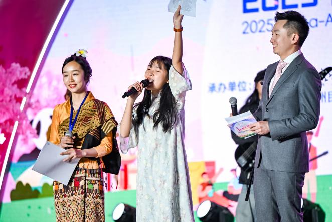 “初绽之章”中,中国语言文化学院越南留学生阮氏翠贤以字正腔圆的中文主持惊艳全场,完美诠释了我校“以文载道、以文化人”的教育理念。她与贵州开放大学同学合唱的《华夏》,搭配贵州师范大学同学们的武术,用方言展示潮流文化的国际融合,既展现了“各美其美,美美与共”的文化包容,又体现了“和而不同”的交流智慧,这场跨越国界的艺术对话,让文化差异升华为友谊的桥梁。