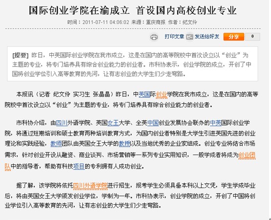 中英国际创业学院,由四川外语学院、英国女王大学、全英中国创业发展协会联办,旨在推进中英在知识、技术创新、创业方面的合作。创业学院将开展创业短期培训和创业学硕士教育,为国内的创业者特别是大学生引进英国先进的创业理念和实践经验。教师团队由国内大学的精英、英国女王大学的顶级教授和当地的企业家组成,创业教育将结合市场需求,通过开设投融资、商业谈判、商业策划和计划书撰写、市场营销、商业推广等一系列实用的专业课程,培养具有国际视野的创业团队的领导者和管理者,帮助有科技创新项目专利的人士成功创业,将智力、技术成果转变为现实生产力,从而推动中国大陆地区的技术创新及创业教育的发展。 中英国际创业学院将依托四川外语学院招生,报考学生必须具备本科以上的文凭,短期培训的合格者将获得英国女王大学颁发的证书,申请创业学硕士学位的学生在英国学习一年,合格者将获得英国女王大学的创业学硕士学位。 中英国际创业学院的成立开创了中国将创业学位引入高等教育的先河,对高等教育和高校学生创业、职业发展将是划时代的举措,因此引起了海内外各大媒体的强烈反响,中国日报网络版、重庆商报、科学时报、中国新闻网、新华网、腾讯大渝网、凤凰网等媒体竞相报道。伴随媒体的频繁报道,四川外语学院的名字也在短短的时间内再一次响彻祖国大江南北,极大地提升了四川外语学院在国内和国际上的形象和地位。 国内媒体报道链接: