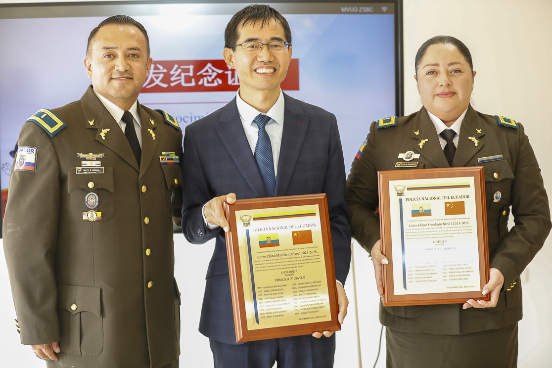当地时间2025年6月9日,由中国驻厄瓜多尔大使馆与思源中国语学校孔子课堂联合开设的第二期厄瓜多尔国家警察中文培训课程结业仪式在思源中国语学校隆重举行。中国驻厄瓜多尔大使馆代办魏琳、中国驻厄瓜多尔大使馆领事刘昱初、厄瓜多尔国家警察教育总监豪尔赫·塞瓦略斯以及思源中国语学校校长曹孝宏出席典礼。