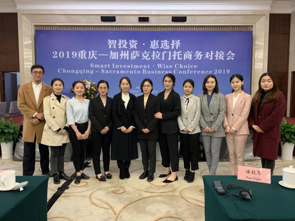 国际关系学院2015级学生贾思梅、徐婉仪、陈彦霖、聂巧仪、王玥纯、谭文静、江静兰,2016级学生何国锐、唐荔莎、邹汶伶、任子懿、康钟月承担了此次访渝代表团的接待服务工作。其中,徐婉仪、聂巧仪担任了代表团在渝行程的全程陪同接待工作,其余十位同学则主要负责重庆—加州萨克拉门托商务对接会的翻译服务工作。