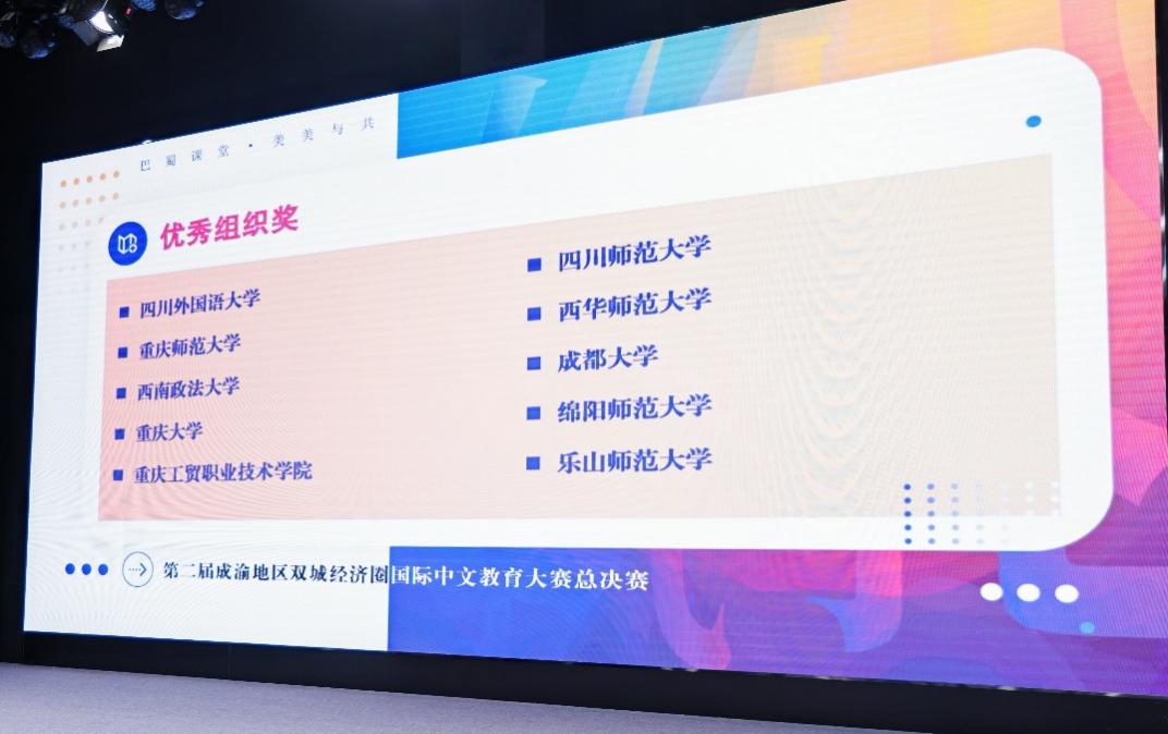 据悉,成渝地区双城经济圈国际中文教育大赛是川渝地区规格最高、规模最大、影响最深的国际中文教育赛事。本届大赛由四川省教育厅、重庆市教育委员会主办,四川师范大学、重庆师范大学承办,成渝地区双城经济圈孔子学院(国际中文教育)联盟、四川省孔子学院(国际中文教育)联盟和重庆市国际中文教育联盟协办。大赛共吸引川渝两地60余所高校300余名优秀学子参与。