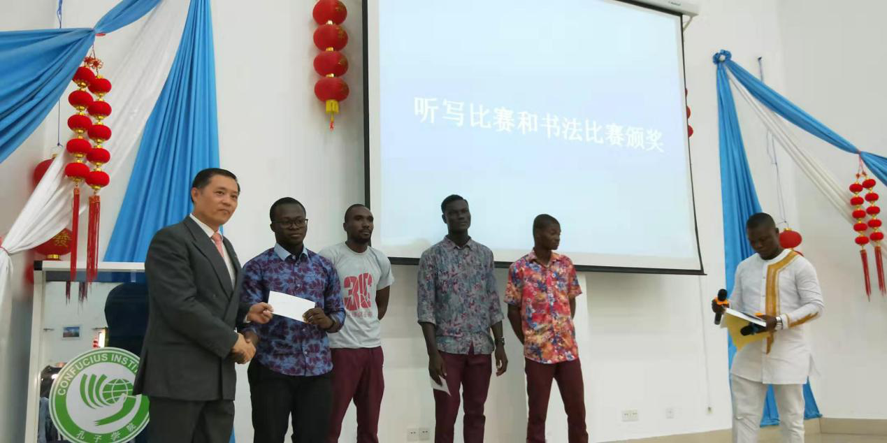 在节目进行过程中,还进行了洛美大学孔院春节系列活动中听写和书法比赛颁奖仪式,胡平参赞、柯铎处长、阿莫夫人、外方院长佳思美、中方院长周平为获奖选手颁奖。