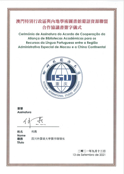 2021年9月13日,由澳门大学倡议成立的“中国澳门特别行政区与葡语国家学术图书馆联盟"和“澳门特别行政区与内地学术图书馆葡语资源联盟",举办线上合作协议书签字仪式。