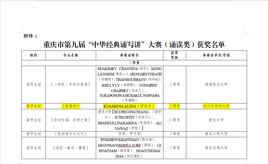 我校国际学院KUSAKINA ALINA(丽安生)同学提交的朗诵作品《致橡树》,发音标准,感情饱满,经过层层选拔,荣获重庆市第九届“中华经典诵写讲”大赛(诵读类)三等奖。