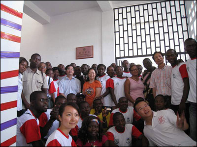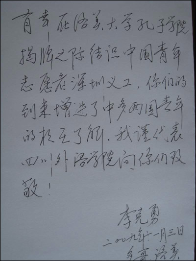 在太阳集团tyc122cc,李校长见到了在洛美工作的中国青年志愿者深圳义工,并欣然应邀为深圳义工题词。