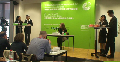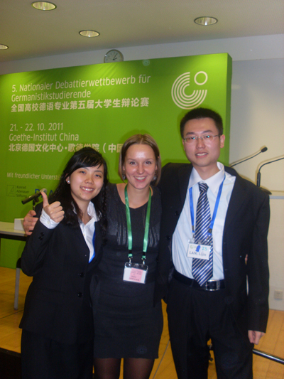| 10月21日至22日在北京歌德学院举行了第五届全国高校德语专业大学生辩论赛(5. Nationaler Debattierwettbewerb für Germanistikstudierende )。我系派出蓝李晋和马迅同学组成的川外代表队经过激烈的竞争,奋力杀入全国八强,勇夺团队三等奖,并摘取了四项单项奖中的最佳男辩手和最具说服力两项大奖,载誉而归。 参赛学校众多 出线形势严峻 本次比赛共有来自全国的40个德语专业参加,其中北京大学、复旦大学、南开大学等高校悉数参加。小组赛中,所有的参赛队伍被抽签分入4个组,每组只有前两名才能小组出线,所以想要脱颖而出还是相当有难度。经过一辩陈述、自由辩论以及二辩总结等三个环节的激烈争夺,川外代表队突破重围,顺利晋级全国八强。 四分之一决赛 加赛憾负南开 21日小组出线之后,川外代表队迎来了强劲的四分之一决赛对手南开大学。双方在20分钟常规赛的你争我夺之后,评委们竟打出了相同的分数!于是组委会决定加赛一场。加赛的现场双方依旧争夺激烈,蓝李晋和马迅侃侃而谈,多次赢得现场观众及评委的热烈掌声,但无奈对方发挥更胜一筹,川外代表队遗憾地止步于四分之一决赛。 展川外学子风采 创总分单项佳绩 本次辩论赛是我系继07年首届全国高校德语专业大学生辩论赛之后再一次进入八强,总分平了我系参加辩论赛以来的最好成绩,特别是蓝李晋一人就获得了四项单项奖中的最佳男辩手奖和最具说服力奖,表现尤其出色。选手们精彩的发挥和表演,以及最后取得的喜人成绩,显示了德语系高质量的德语教学水平,展示了我川外学子的风采。 供稿 郭智 唐炜