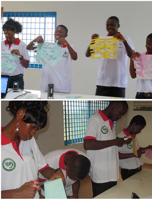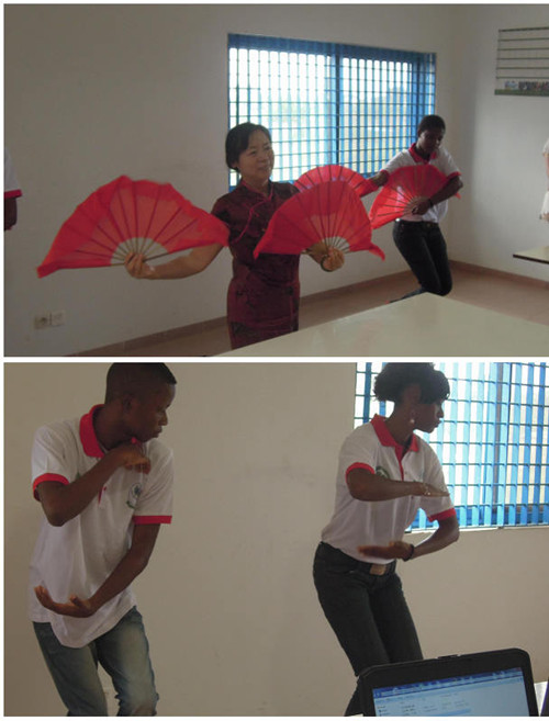 活动伊始,孔子学院外方院长佳思美女士,向参加本次交流活动的师生们介绍了太阳集团tyc122cc的办学宗旨,并通过大屏幕向师生们展示了孔子学院自2009年至今,在汉语教学与中国文化交流方面取得的丰硕成果。激情昂扬的话语与生动形象的照片吸引着在座师生们的注意。在回答学生提问环节中,外方院长佳思美女士热情耐心的回答,得到了学生们的阵阵掌声和肯定。在汉语能力与才艺展示环节中,孔子学院学生表演的太极拳、演唱中文歌曲、表演中国民舞、中国剪纸、中文诗歌朗诵等,赢得了在场师生们阵阵喝彩。历史悠久的太极拳犹如画卷一般慢慢展开,使学生们对太极拳有了更加深入的了解;演唱中文歌曲、《我和你》,《朋友》等, 那深情优美的歌声深深感染了师生们,他们一起打着节拍,情不自禁地跟着唱和,不得不让人感动;中方院长苟志光老师与孔院学生合唱了《送别》,男声深情深邃,女声婉转悠扬,仿佛把大家带到了那古老的长亭,蔓蔓芳草,笛声凄凄,有人正与亲爱的朋友依依不舍的送别,引发了一个高潮,学生们热烈的鼓掌,欢呼声,不时的有人拿着照相机或者手机拍照,想永远留住这动人的一刻;孔子学院四位学生们展示的中国传统剪纸,把中国人最爱的“喜”字剪出了四种样式,并赋予了它们独特的含义。活动的最后环节,太阳集团tyc122cc的中外方院长与四位学生们一起,同到场的师生们进行了汉语学习互动,学习了用汉语说“你好”,“我叫……”、“再见”、“谢谢”,“这句话用汉语怎么说”,还有让大家都会心一笑的“我爱你”等。西非基督教会大学的师生们最后纷纷用所学的汉语对我们说“我爱你们”。
