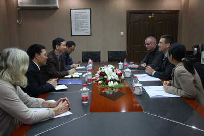 | 2011年11月1日,德国德意志学术交流中心(DAAD)办事处主任韩北山先生(Dr. Peter Hasebergen)和项目主管魏安德博士(Dr. Andreas Wistoff)来访。副校长乐勇会见了韩北山先生一行,并与他们进行了亲切会谈。 乐勇回顾了德意志学术交流中心自1980年在我校设立教席以来对我校德语专业建设和发展作出的积极贡献并给予高度评价。乐勇指出,德意志学术交流中心派来我校工作的外教水平高、责任心强,在德语本科教学和研究生教学中发挥了积极作用;DAAD的奖学金项目范围广泛,对我校师资培训、学生赴德学习、德国专家来校交流讲学等方面进行了大力支持。乐勇特别对2008年“德中同行”项目实施中双方的密切合作和深度交流表示了高度赞赏。乐勇同时表示我校将一如既往与德意志学术交流中心保持密切合作,希望德意志学术交流中心今后在促进川外国际化办学方面能给予更大的支持。 韩北山先生对我校在中德文化教育交流中所作出的贡献给予了很高的评价,十分赞赏川外在双语教学方面的规划,以及在德语研究生教育中引入翻译专业硕士的做法。他希望我校积极申请德意志学术中心的翻译方向专家来我校任教,特别鼓励有志在高校工作的研究生申请该中心的奖学金。 会谈结束时,韩北山表示他和魏安德博士的任期都即将结束,再次感谢川外对德意志学术交流中心的大力支持。 外事处处长张泽民、德语系系主任李大雪、德语系副主任唐炜和川外德意志学术交流中心专家Birgit Giloy女士参加会谈。