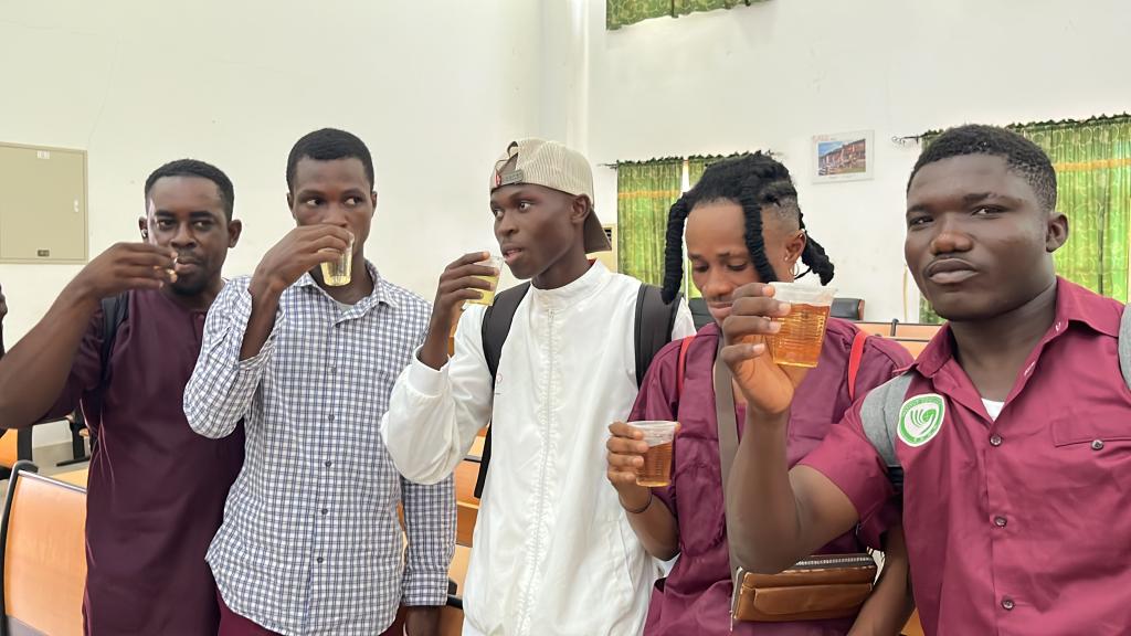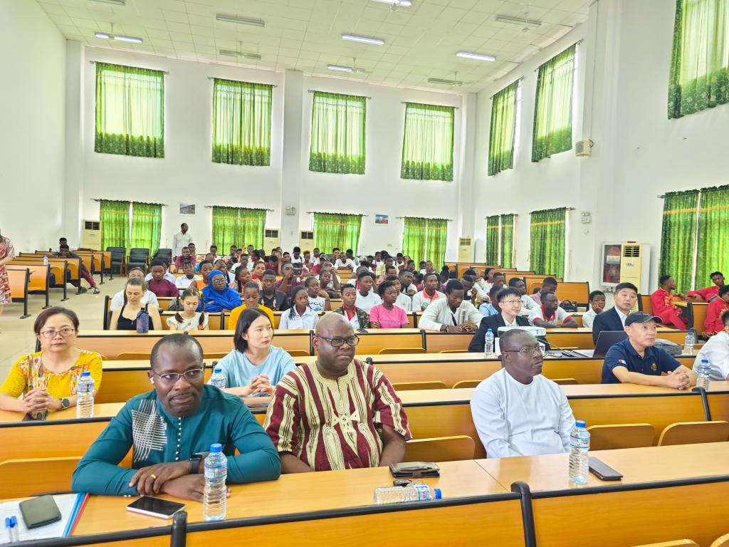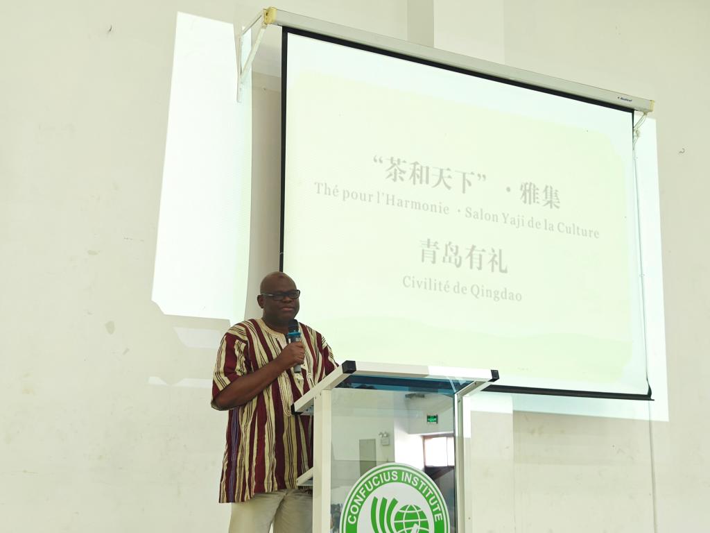 上午场是在孔院礼堂举行的中国茶文化讲解和体验,洛美大学第一副校长巴塔维拉、洛美大学国际处处长茨贝、青岛市文化和旅游局访多代表团、贝宁阿博美卡大学孔子学院中方院长赵华修、太阳集团tyc122cc中外方院长朱玉珊、艾布多以及孔院师生共计100余人参加了上午的活动。